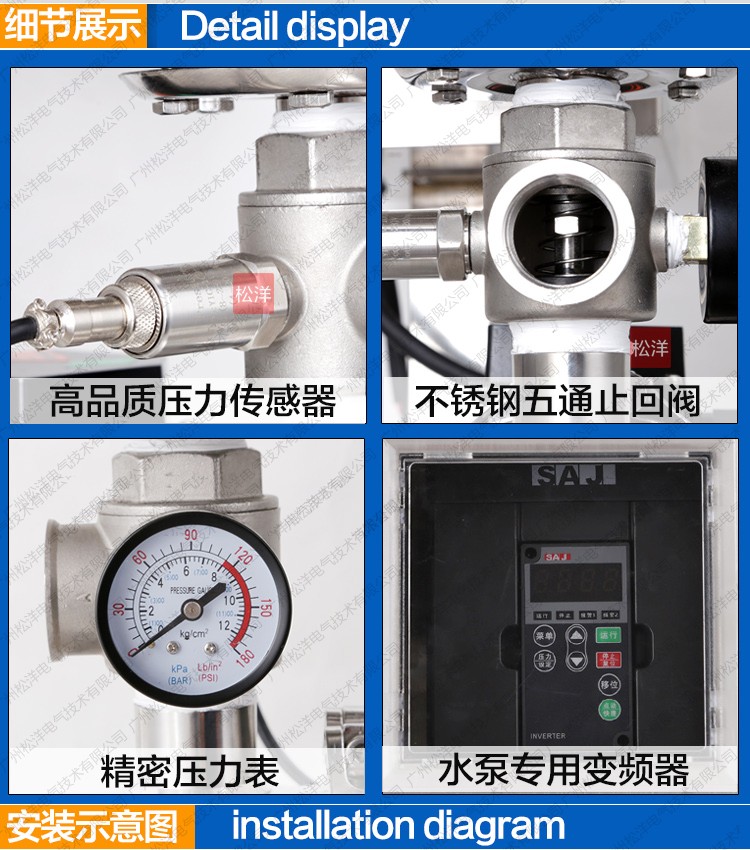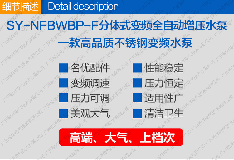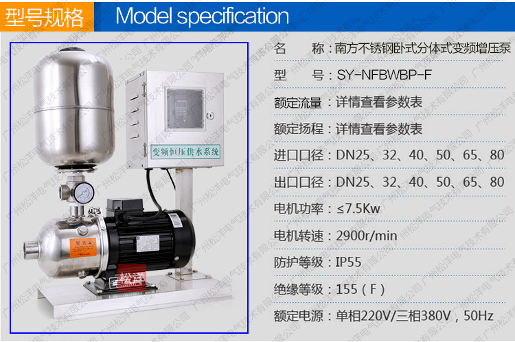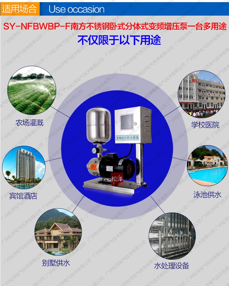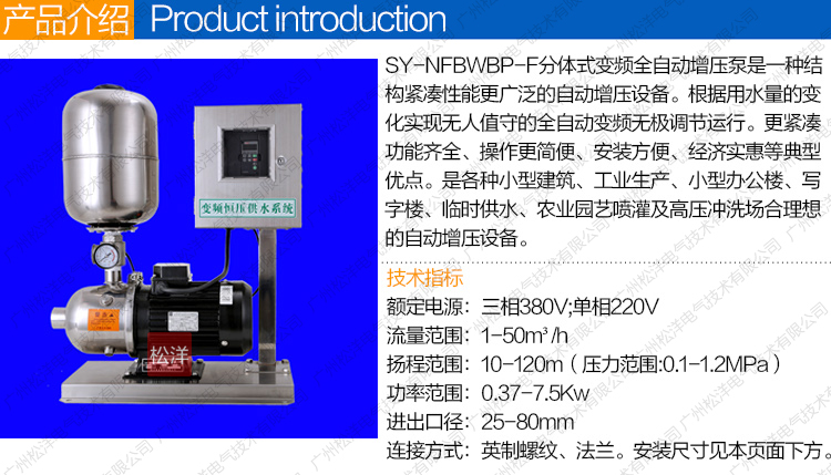 SY-NFBWBP-F分体式变频全自动增压泵是一种结构紧 凑性能更广泛的自动增压设备。根据用水量的变化实现无 人值守的全自动变频无极调节运行。更紧凑功能齐全、操 作简便、安装方便、经济实惠等典型优点。是各种小型建 筑、工业生产、小型办公楼、写字楼、临时供水、农业园 艺喷灌及高压冲洗场合理想的自动增加设备。