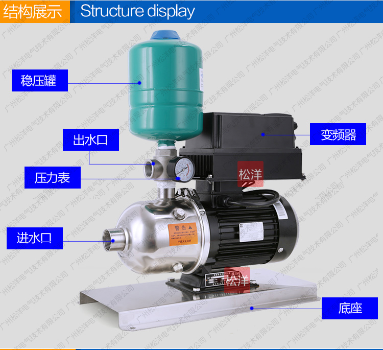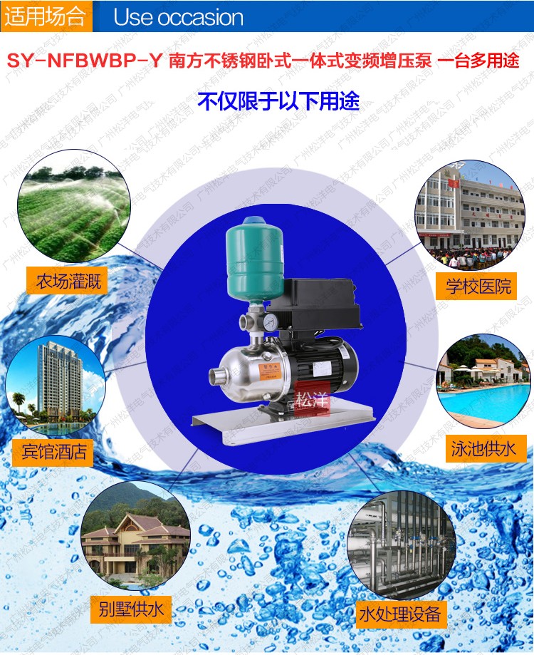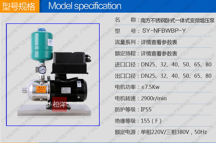 SY-NFBWBP-Y南方不锈钢卧式一体式变频增压泵是一种 结构紧凑性能更广泛的自动增压设备。根据用水量的变化 实现无人值守的全自动变频无极调节运行。更紧凑功能齐 全、操作简便、安装方便、经济实惠等典型优点。是各种 小型建筑、工业生产、小型办公楼、写字楼、临时供水、 农业园艺喷灌及高压冲洗场合理想的自动增加设备。