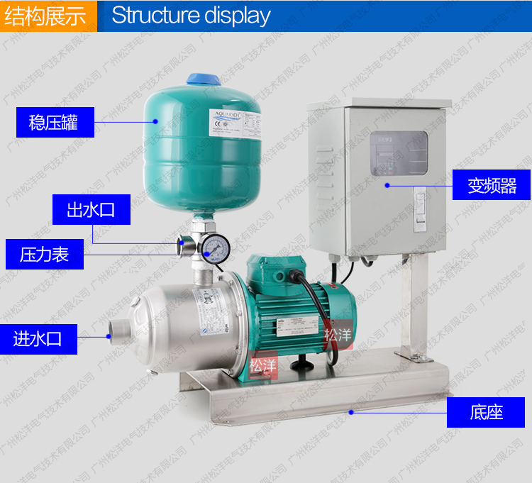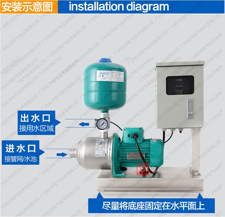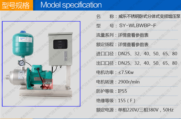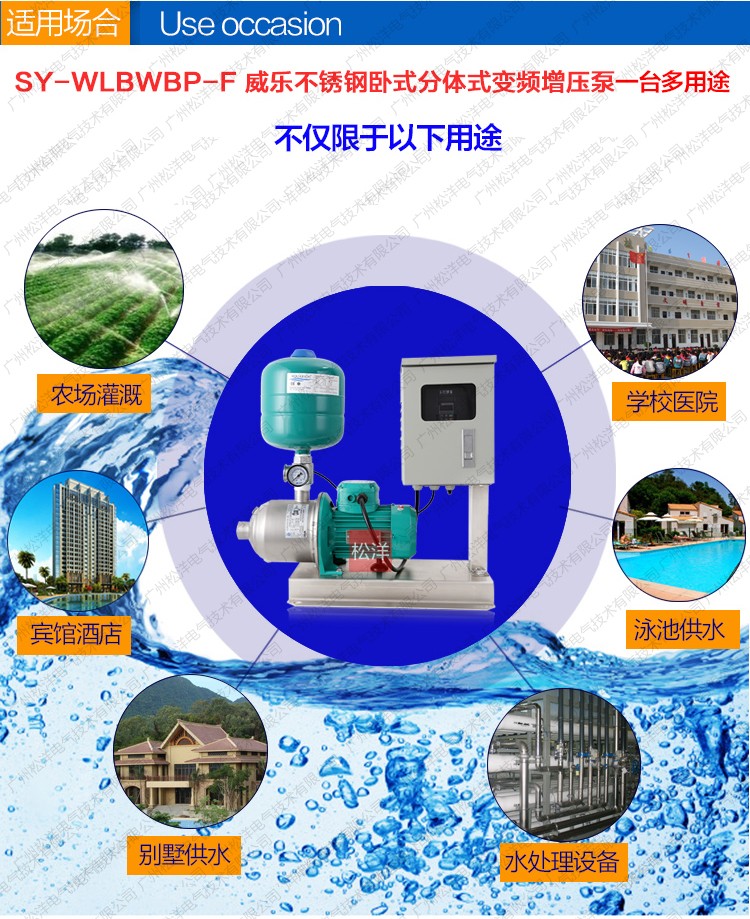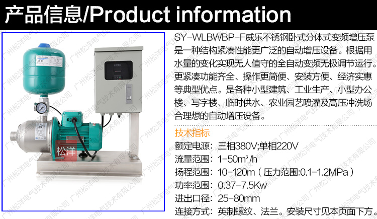 SY-WLBWBP-F威乐不锈钢卧式分体式变频供水设备是一种 结构紧凑性能更广泛的自动增压设备。根据用水量的变化 实现无人值守的全自动变频无极调节运行。更紧凑功能齐 全、操作简便、安装方便、经济实惠等典型优点。是各种 小型建筑、工业生产、小型办公楼、写字楼、临时供水、 农业园艺喷灌及高压冲洗场合理想的自动增加设备。